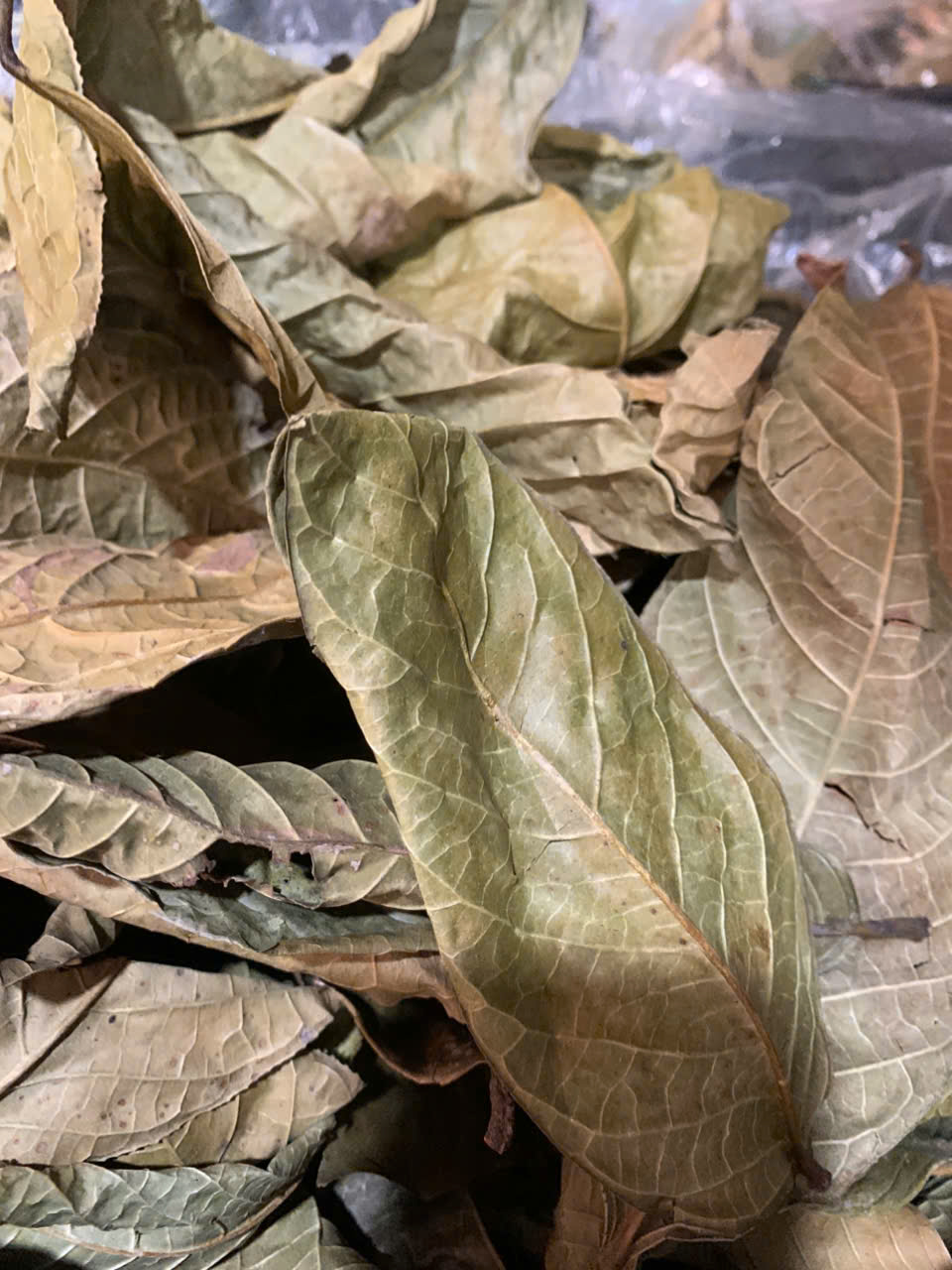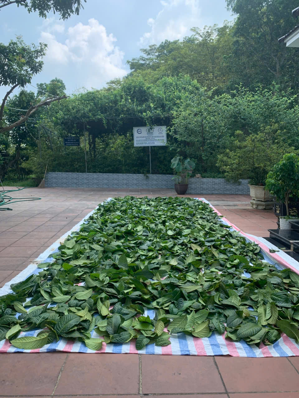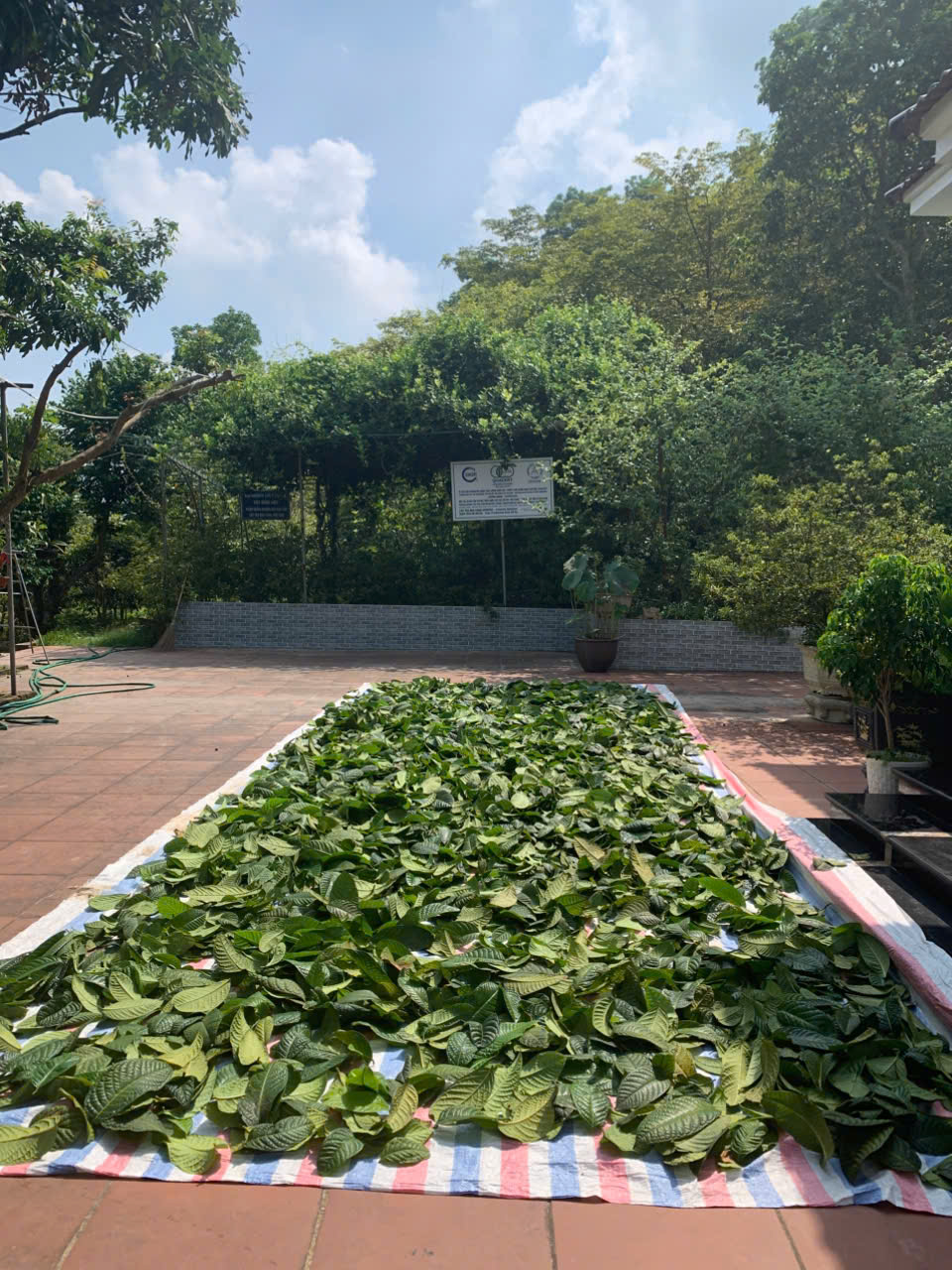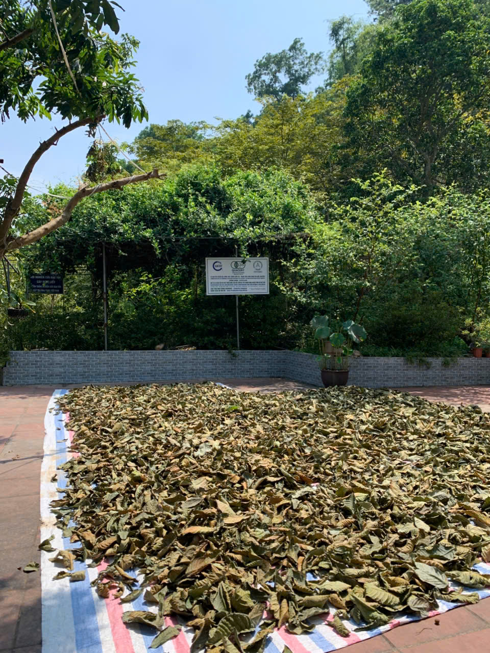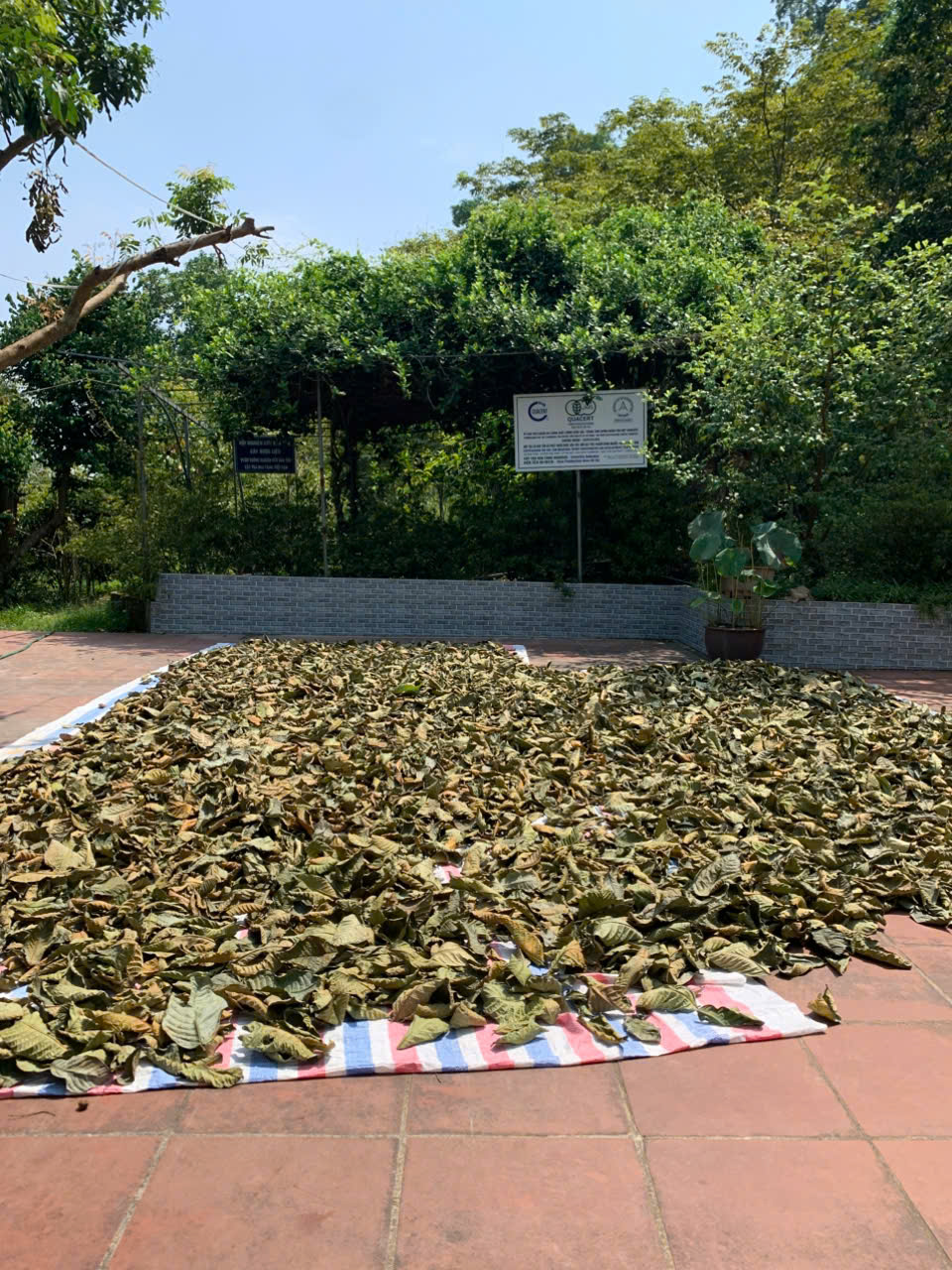 05-08-2025 12:08:00 Phơi sấy thủ công Sau khi thu hoạch, lá trà được phơi trên lớp bạt dứa và cách ly với khu vực chăn nuôi. Tổng khối lượng thu hoạch lá tươi 5/8/2025: 34kg Hoàn thành
