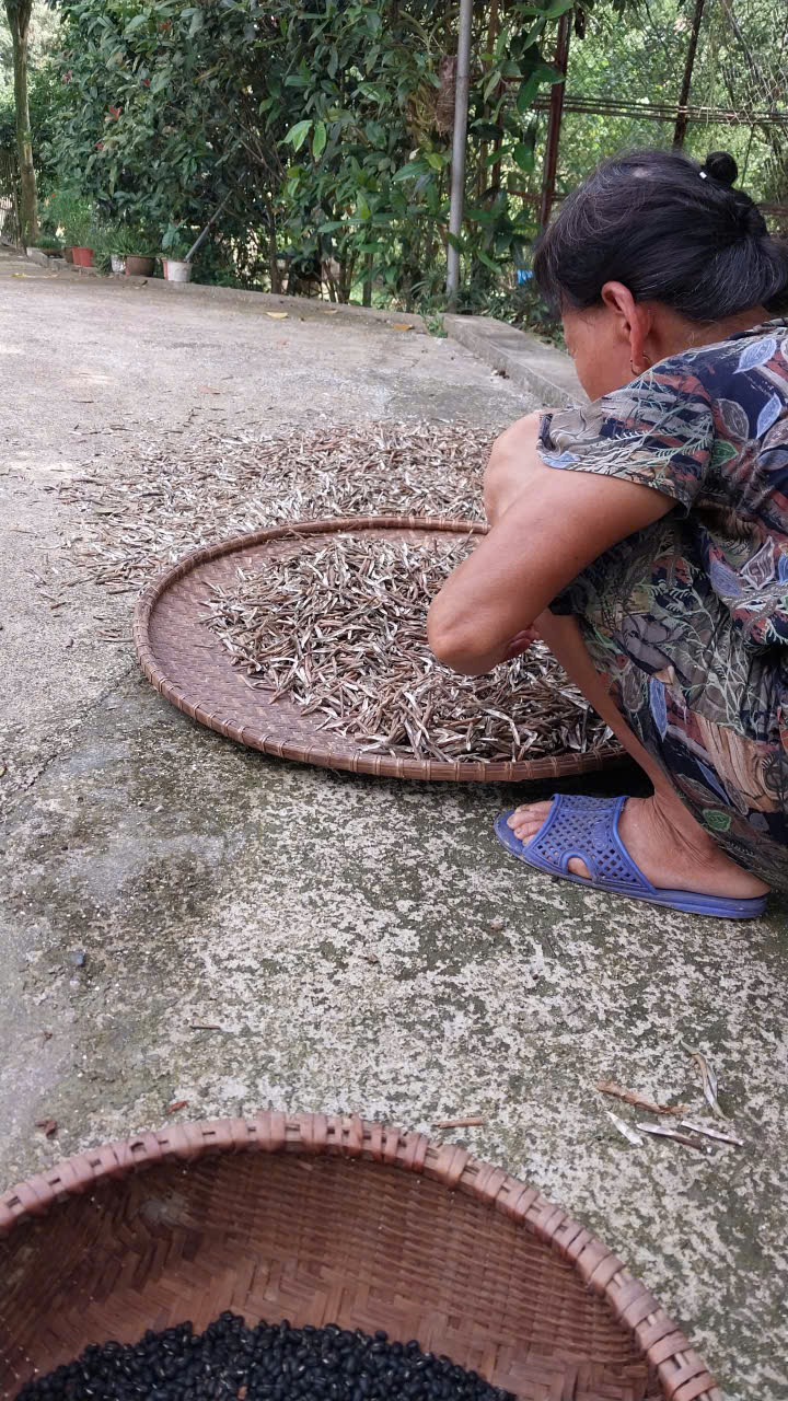 10-06-2025 12:06:00 | Thu hoạch | Tiếp tục thu hoạch và phơi sấy thủ công hạt đỗ đen xanh lòng bản địa đã tách khỏi vỏ hạt trên nong/nia. Tổng thu hoạch đợt 3 sau phơi khô đạt 190kg đỗ đen. | Hoàn thành | |