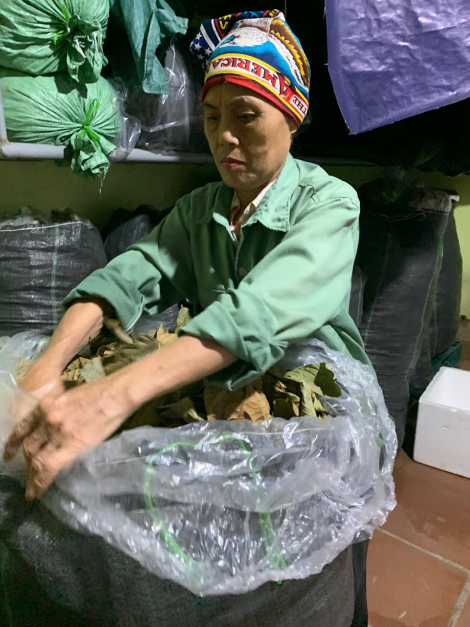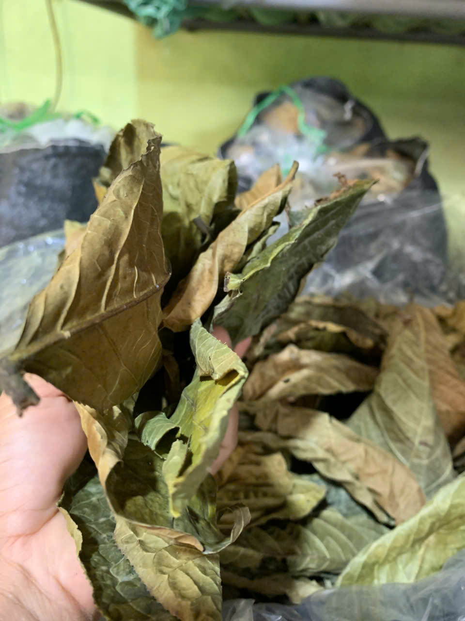 18-09-2025 12:09:00 | Nhà kho bảo quản | Nhập kho tổng khối lượng thu hoạch lá Trà hoa vàng sau các đợt thu hoạch là: 19 (Kg). Lá trà được đóng trong bao nilon trong suốt và đựng trong bao tải dứa rồi xếp lên giá riêng biệt trong kho chứa dược liệu. | Hoàn thành |